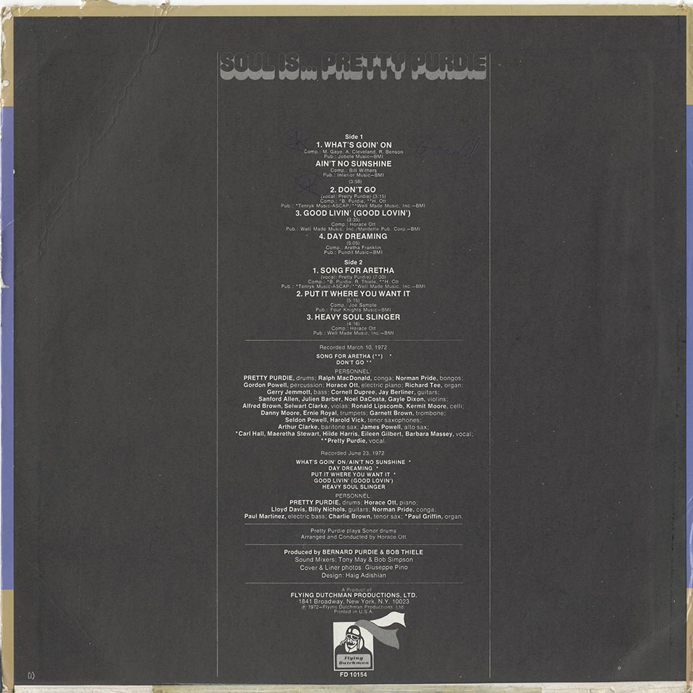 Having signed for Flying Dutchman Productions, Pretty Purdie he began work on what would become Soul Is…Pretty Purdie. It featured seven songs. A medley of What’s Goin’ On penned by Reynaldo Benson, Al Cleveland and Marvin Gaye, melted into Bill Withers’ Lovely Day. Pretty Purdie cowrote four tracks. He penned Good Livin’ (Good Lovin’) with Horace Off. They cowrote Don’t Go with Richard Tee. Bob Thiele joined Pretty Purdie, Horace and Richard to write Song For Aretha. Horace also Heavy Soul Slinger. Other tracks included Aretha Franklin’s Day Dreaming and Joe Sample’s Put It Where You Want It. These tracks became Soul Is…Pretty Purdie.