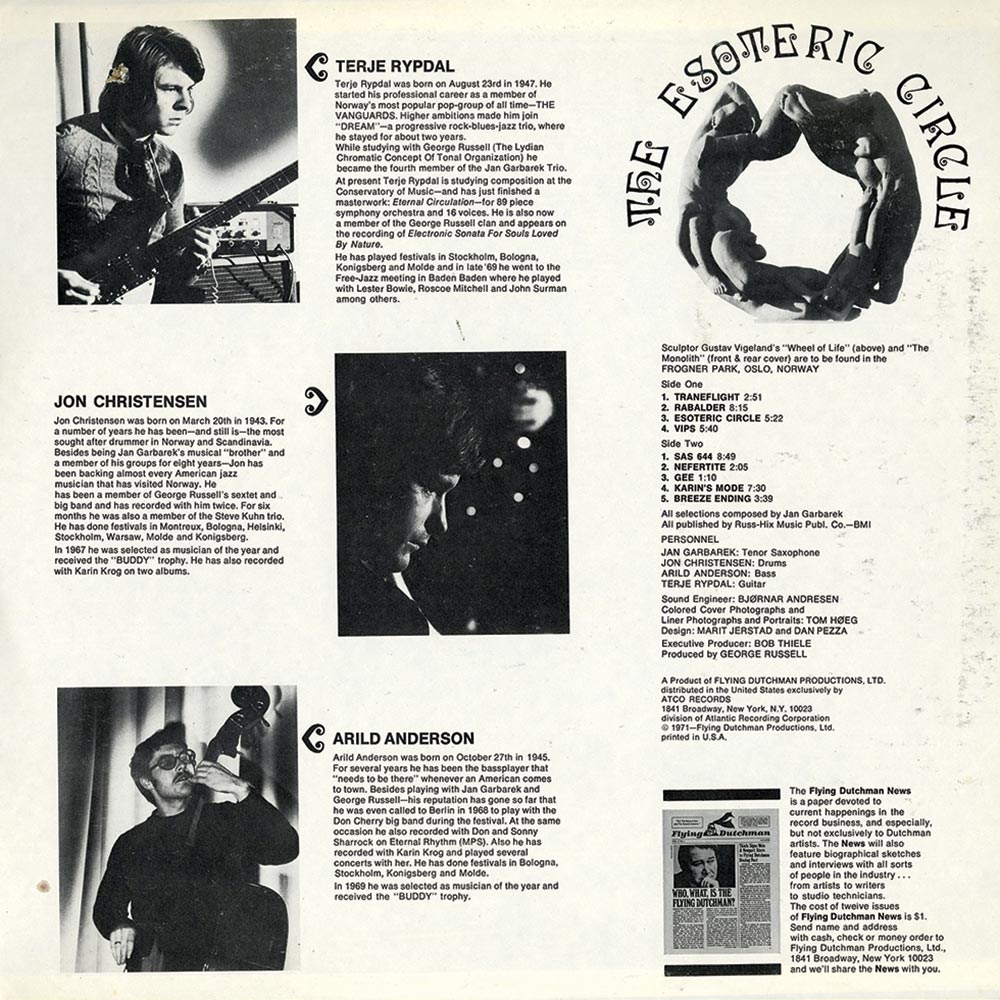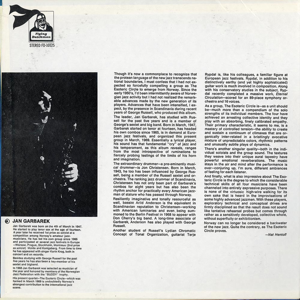 The Esoteric Circle was founded in 1969 by bassist Arild Andersen, drummer Jon Christensen, guitarist Terje Rypdal and tenor and soprano saxophonist Jan Garbarek. The quartet met in Oslo, which in 1969, had a vibrant jazz scene.