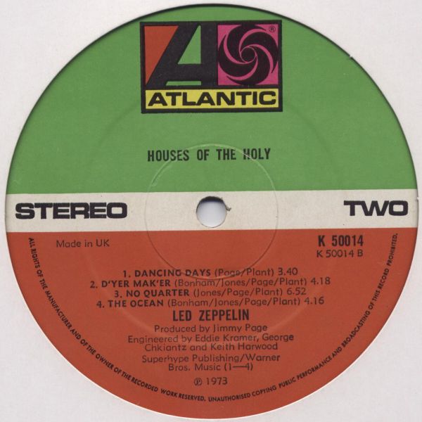 On Houses Of The Holy, the Jimmy Page and Robert Plant songwriting partnership cowrote four tracks, The Song Remains The Same, The Rain Song, Over the Hills and Far Away and Dancing Days. They also penned No Quarter with John Paul Jones. The other three tracks, The Crunge, D’yer Mak’er and The Ocean were written by Led Zeppelin. These eight tracks were recorded between January and August 1972.