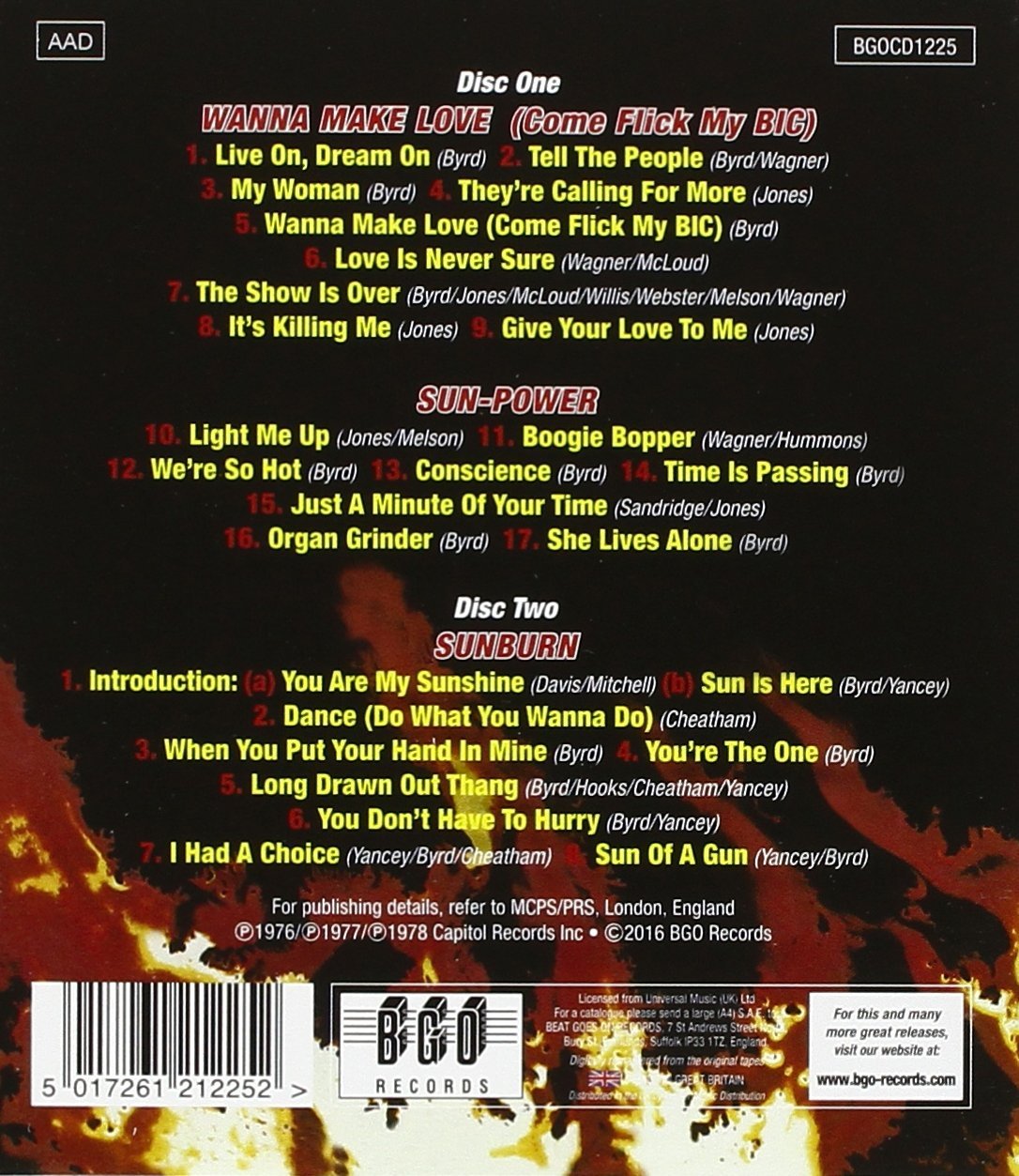 Sun’s most successful albums, were their first three albums; 1976s Wanna Make Love (Come Flick My Bic), 1977s Sun-Power and 1978s Sunburn. These three albums were recently rereleased on BGO Records on two discs. This trio of albums are the perfect introduction to Sun, and feature the best, and most successful albums of their eight year and eight album career.