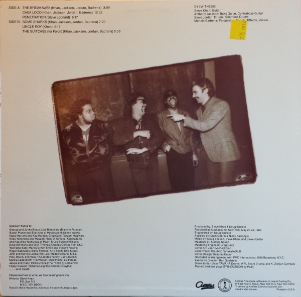 Bassist Anthony Jackson preferred a six string bass. Steve Jordan’s drum kit featured timbales, a cowbell, two hi-hats, two snare drums and even a broken splash cymbal. Percussionist Manolo Badrena’s equipment was constantly evolving. As he went into the Eyewitness’ sessions, he deployed timbales, congas and even a turtle shell. Steve Khan’s band were it seemed, no ordinary fusion band.