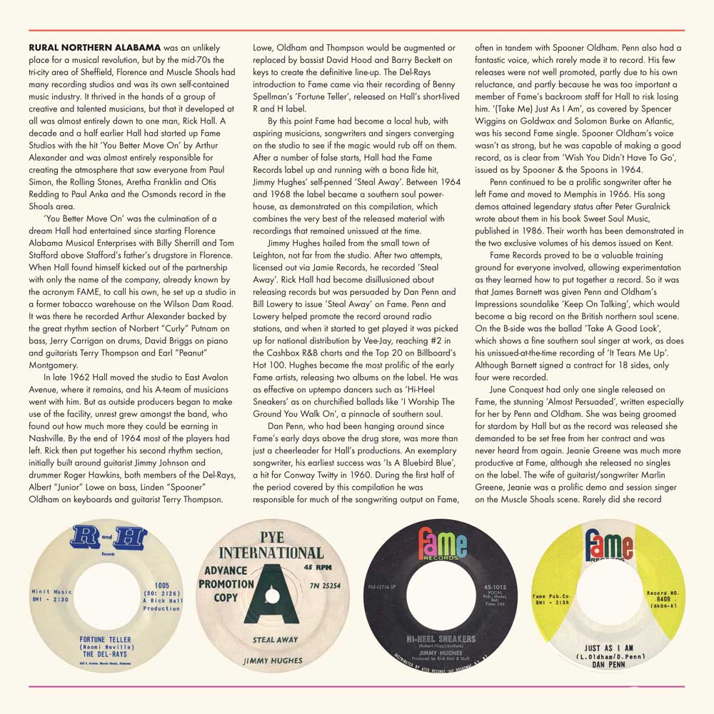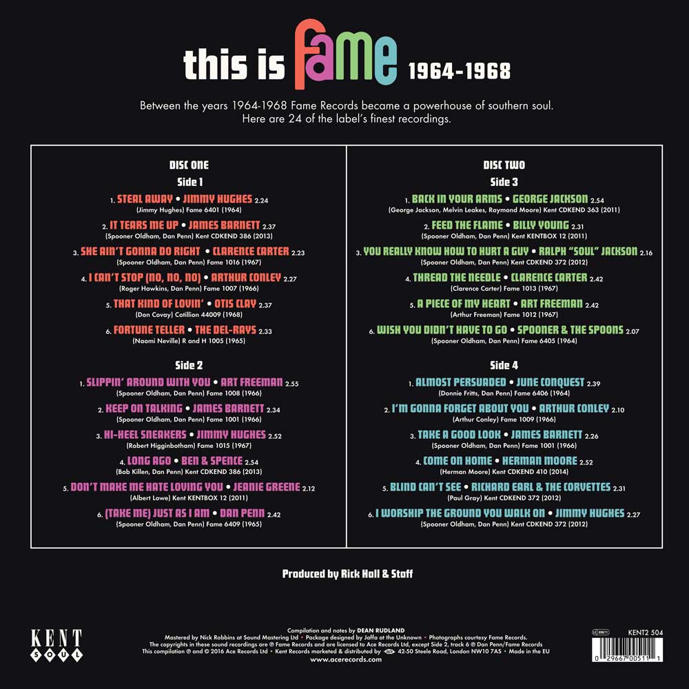 It’s nearly five years since Kent Soul, an imprint of Ace Records began their comprehensive reissue of the music recorded at Fame Recording Studios, in Muscle Shoals. Their most recent release is This Is Fame 1964-1968, which is Kent Soul’s first vinyl release. It’s a double album which features twenty-four songs produced by Rick Hall and featuring the legendary Muscle Shoals Rhythm Section. With songs from Jimmy Hughes, Clarence Carter, Art Freeman, Jeanie Greene, Dan Penn, George Jackson, Billy Young, June Conquest and James Barnett, This Is Fame 1964-1968 is Southern Soul at its best.