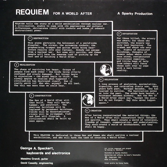 Back in 1981, it was still the Cold War era, and a generation on both sides of the Iron Curtain lived in fear of nuclear war. For A New World is a reminder of these days, and what was the worst case scenario. Requiem replicate the Destruction, Devastation and the Realisation that mankind brought about the destruction of the civilisation. Then Requiem replicate the Construction and Creation of the post war landscape. To do this, George A. Speckert deployed banks of synths and the latest in musical technology. Adding the finishing touch was Massimo Grandi’s guitar. Together, they were responsible for what is nowadays regarded as a lost classic.