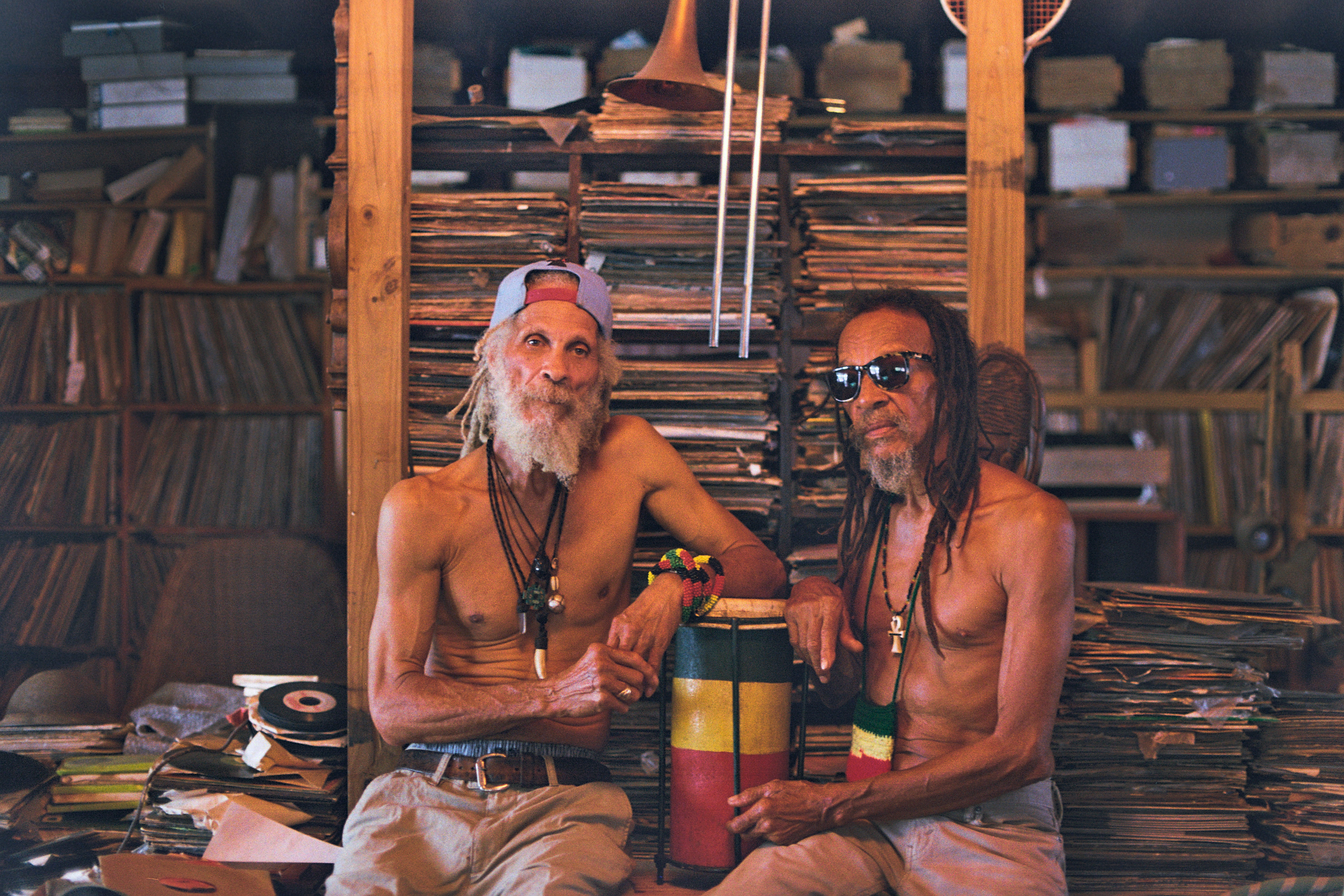 Copies of the records recorded in the studio hang on the wall. So do photos of the artists who recorded at Kiddus I’s studio. Soon, they’ll be joining this roll of honour. As they enter the main studio, Rastafarian paintings hang proudly on the wall. Old friends catch up before the recording gets underway. Some head out through the swing doors and sit on the balcony overlooking Kingston.