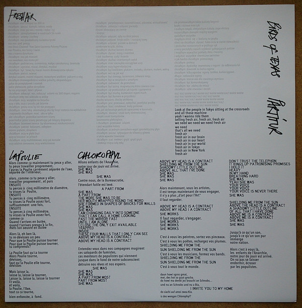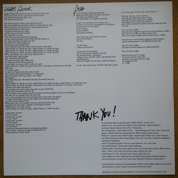 They recorded Barbara Manning in a live lecture, and wave-maker Ysanne Spevack as she played the viola. One night, Faust had the audience rewrite an updated versions of Marseillaise for the track Chlorophyl. For the title-track a poem that was written by a French school friend of Jean-Hervé Péron, which was translated into Polish and recited. To this, Jean-Hervé Péron adds a political reading and sobs, as if he’s been robbed of Fresh Air. By the end of the tour in April 2016, Faust had recorded plenty of material for Fresh Air.