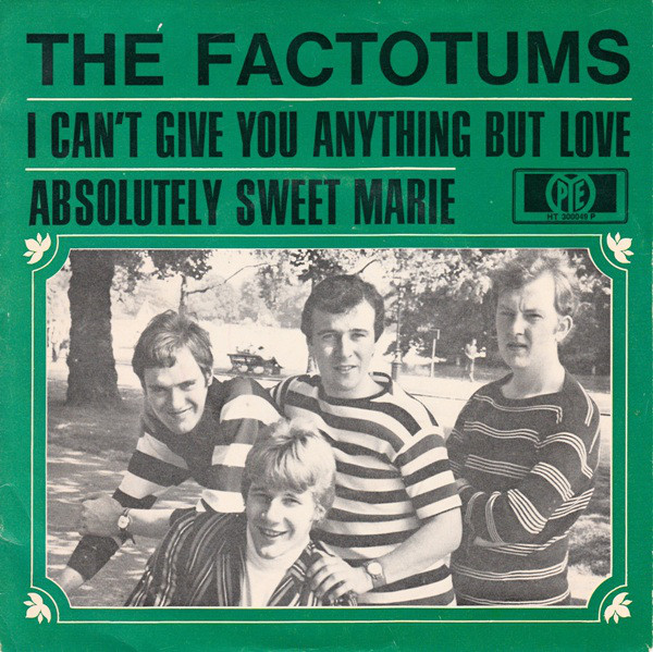 Two years after starting playing the club circuit, Manchester based The Factotums were signed to Picadilly. They released I Can’t Give You Anything But Love as a single in 1966. Tucked away on the B-Side was a carefully crafted cover of Bob Dylan’s Absolutely Sweet Marie. It’s obvious that the members of The Factotums are fans of Bob Dylan, with the lead vocalist trying and succeeding to replicate Bob Dylan’s vocal style. This vocal plays a part in the sound and success of song that could only have been released during one decade…the sixties.