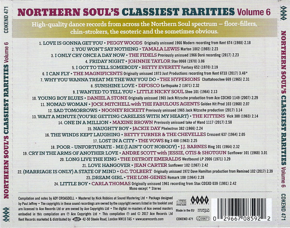 While other compilers are happy to rehash the same tracks for the umpteenth time, Ady Croasdell knows that there’s still mountains of soulful delights awaiting discovery and that it’s just a case of discovering them. Like a musical man from Del Monte, Ady Croasdell goes in search of hidden gems for the Northern Soul’s Classiest Rarities series. Some of these make a welcome appearance on the sixth instalment in this long-running and successful series.