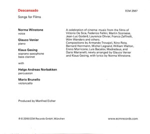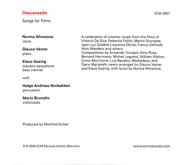 Joining Norma Winstone when the recording of Descansado: Songs For Films began was pianist Glauco Venier, percussionist Helge Andreas Norbakken, Mario Brunelli on violoncello and Klaus Gesing on soprano saxophonist and bass clarinet. Producing Descansado: Songs For Films was Manfred Eicher the founder of ECM Records. They recently released Descansado: Songs For Films, which is the first album from Norma Winstone in nearly four years.