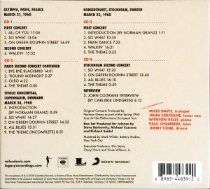 The remainder of disc two features the concert was at the Tivolis Koncertsal, Copenhagen, in Denmark, on the ‘24th’ of March 1960. After Norman Granz introduces the band, they launch into a set that was similar to the one they played in Paris three nights earlier. It opens with So What where John Coltrane quickly takes centre-stage and plays a starring role. Occasionally he over-blows and produces a dissonant, primal sound that provides a contrast to Miles Davis’ more restrained style. Still, though, there’s a degree of tension which disappears On Dolphin Street, as the band raise their game becoming one. Then on All Blues from Miles Davis’ from Kind Of Blue, is at his innovative best John Coltrane constantly overblowing his saxophone, which veers between dissonant and melodic as he embraces the freer style of playing. Later, pianist Wynton Kelly delivers a flawless solo, and plays his part in the successful modal reinvention of All Blues which becomes a sixteen minute opus. After that, The Theme closes the show and once again, Miles Davis and his band receive a standing ovation.