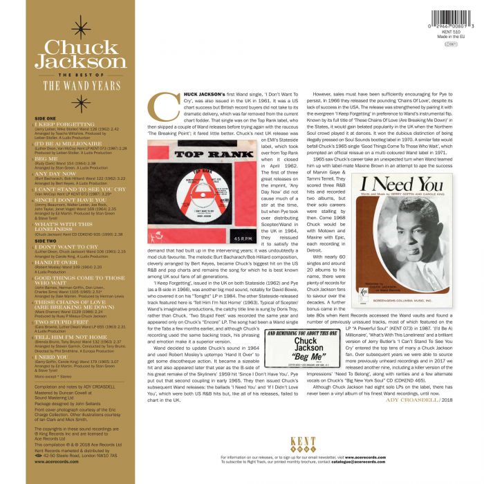 Chuck Jackson released a total of ten albums and thirty singles between 1961 and 1966, and enjoyed seventeen hit singles in the US R&B charts and nineteen in the US Billboard 100. This was the most successful period of Chuck Jackson’s long career, and it’s been documented and celebrated by Kent Soul, an imprint of Ace Records over the past three decades, including on the newly released The Best Of The Wand Years which was released on vinyl by Kent Soul.