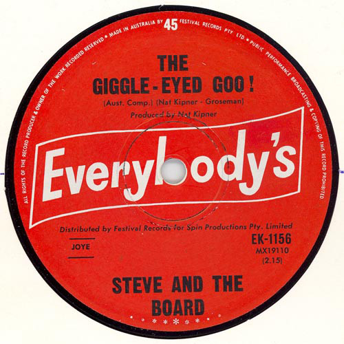 Nat Kipner was able to secure Steve and The Board priceless publicity. He was involved with the children’s television show Saturday Date, and ran a competition that had children send in a drawing of what The Giggle-Eyed Goo! looked like. This was invaluable promotion, and propelled The Giggle-Eyed Goo! to number four in the Melbourne charts and thirty-four in the Brisbane charts. While the song gave Steve and The Board their first hit single, it proved to be a double-edged sword.