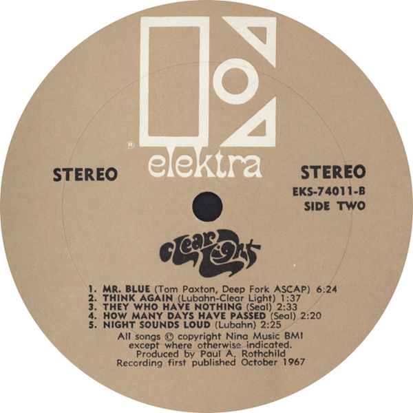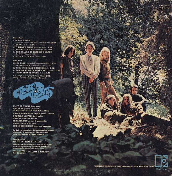 With nine songs recorded, Paul Rothchild decided that to complete the album, Clear Light should record two songs by members of Elektra Records’ family. The songs he had chosen were Greg Copeland and Steve Noonan’s Street Singer and Tom Paxton’s Mr. Blue. These two songs Paul Rothchild felt, would be ideal for Cliff De Young’s “Hamlet on acid delivery.” This would prove true. However, by then, Clear Light were beginning to resent Paul Rothchild.