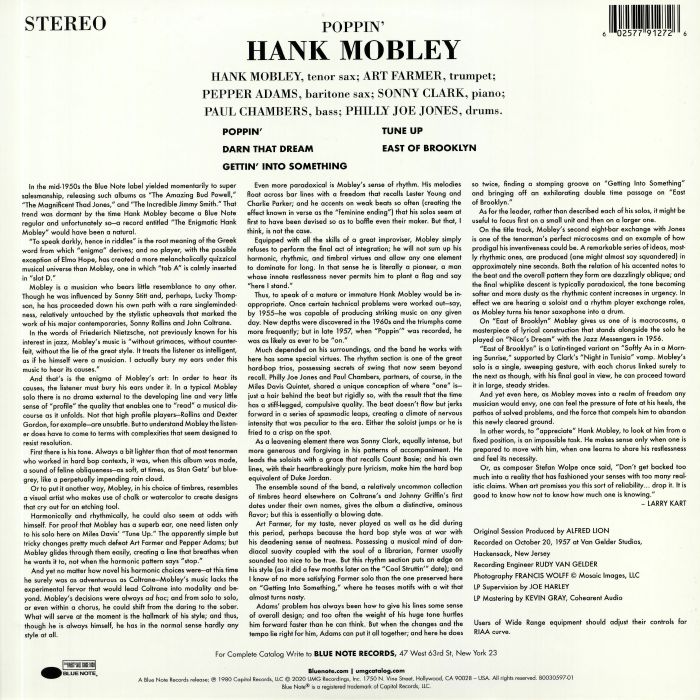 Hank Mobley had signed to Blue Note Records in 1955, and by the time he journeyed to Van Gelder Studio, in Hackensack, New Jersey on the ‘20th’ of October 1957 he had already released seven albums for the label. He had also recorded two other albums which were still be released and Poppin’ the album he was about to record, made it three. This was the way that producer Alfred Lion who cofounded Blue Note Records in 1939 liked to work.