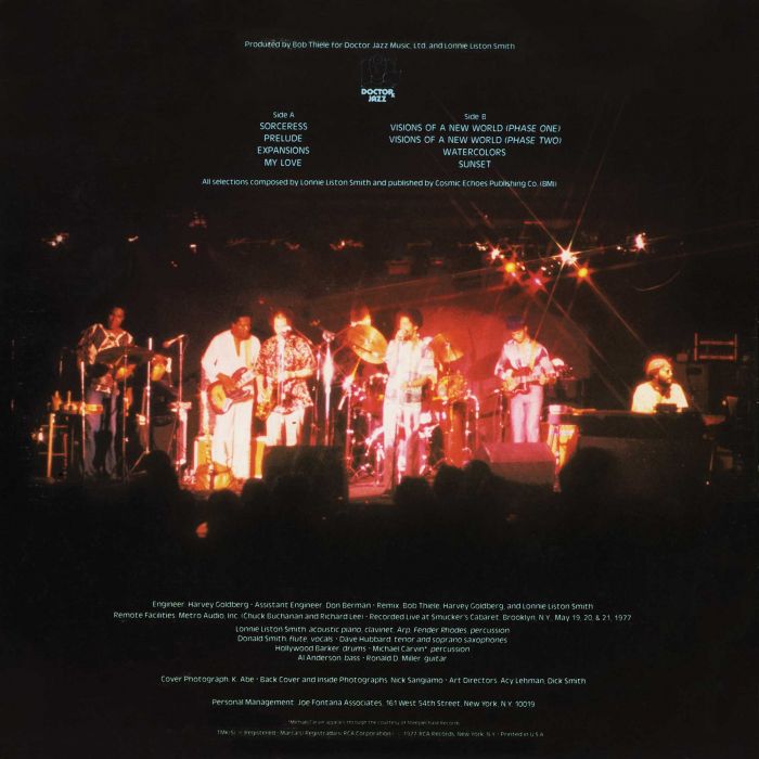 Japanese photographer Katsuji Abe had been commissioned to take photographs during the three concerts. Eventually, Lonnie Liston Smith and Bob Thiele chose the striking “action” shot of the charismatic bandleader on stage. On the back cover of Live! was a photo of the entire band and the track listing.