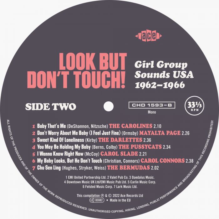 Closing Look But Don’t Touch! Girl Group Sounds USA 1962-1966 is Chu Sen Ling by The Bermudas. It was the B-Side of Donnie, which was the group’s first single for Era in 1964. It’s a reminder of the early sixtes West Coast sound which is still popular and remembered fondly today.